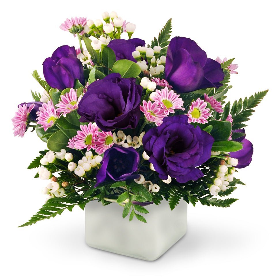 Celebrate love, friendship, or any special moment with the Wishes and Kisses bouquet. This charming arrangement features delicate purple lisianthus, soft pink mini daisies, and white waxflowers, all accented with lush green leatherleaf and pittosporum. Arranged in a frosted white glass cube vase, it’s an elegant yet playful gift for any occasion.